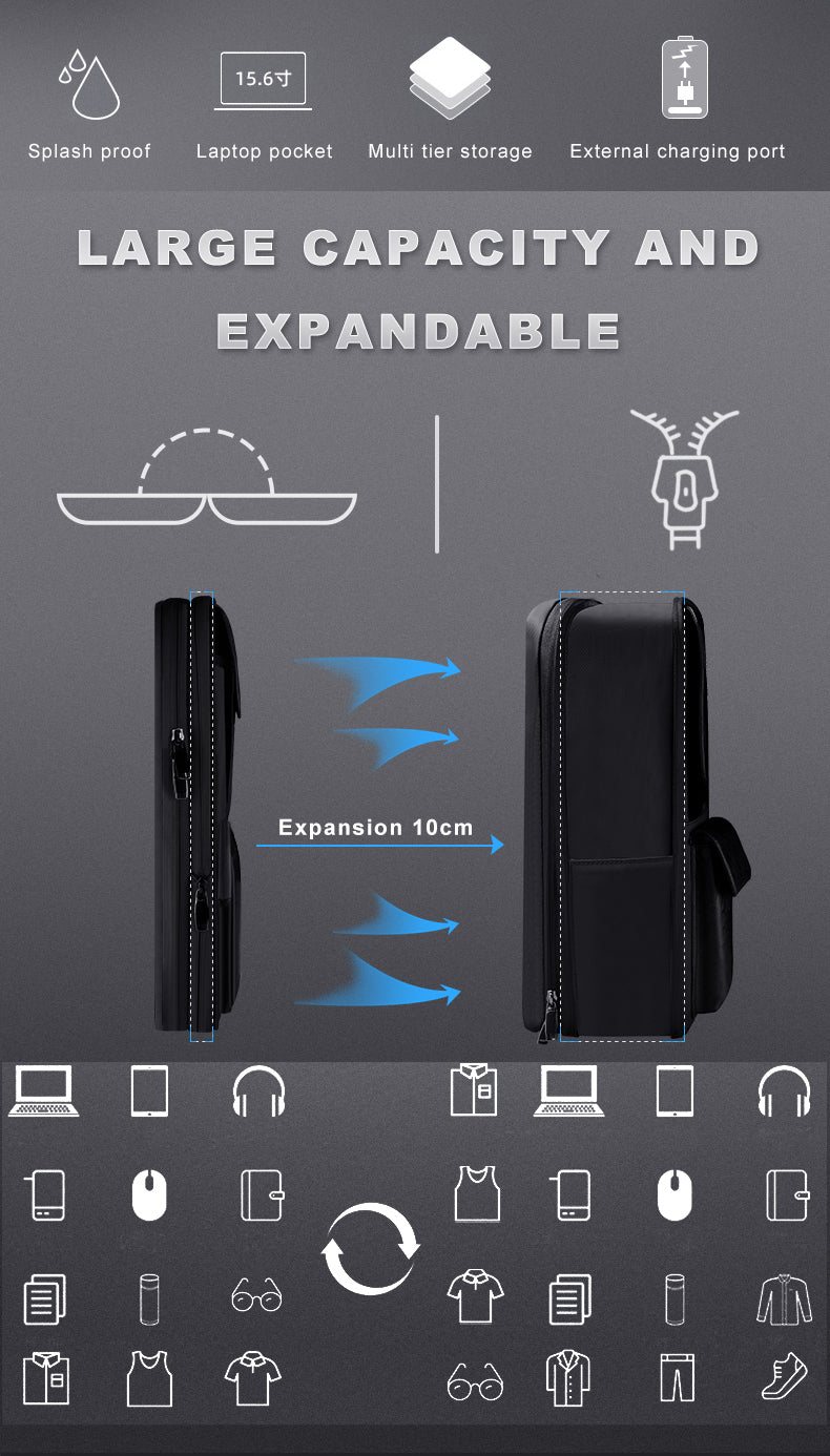Material and Features: Made of premium synthetic leather and polyester cloth are waterproof and durable. The travel laptop backpack owns a variable capacity for more flexible to load. Two modes for daily commute and business trip and easy to transform between both. the slim mode for going to home and school or office by cycling, the expanded mode of the large capacity to meet your camping, day trip and overnight trip.